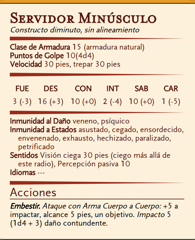 Tocas un objeto diminuto, no mágico, que no está unido a otro objeto o una superficie y que no está siendo cargado por otra criatura. El objetivo se anima y le brotan pequeños brazos y piernas, convirtiéndose en una criatura bajo tu control hasta que el conjuro termina o la criatura cae a 0 puntos de golpe. Ver el bloque de estadísticas para sus estadísticas. Como acción adicional, puedes comandar mentalmente a la criatura si está a 120 pies de ti. (Si controlas varias criaturas con este conjuro, puedes comandar a cualquiera o todas al mismo tiempo, emitiendo el mismo comando para cada una). Tú decides qué acción tomará la criatura y dónde se moverá durante su próximo turno, o puedes emitir un comando simple y general, como buscar una llave, quedarse de guardia, o apilar algunos libros. Si no emites órdenes, el sirviente no hace nada más que defenderse contra criaturas hostiles. Una vez que se le da una orden, el servidor continúa siguiendo esa orden hasta que se complete su tarea. Cuando la criatura cae a 0 puntos de golpe, vuelve a su forma original, y cualquier daño restante se transfiere a esa forma. A niveles superiores. Cuando lanzas este conjuro usando una ranura de conjuro de 4° nivel o superior, puedes animar dos objetos adicionales por cada nivel de ranura por encima del 3°
